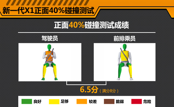 正面40%重叠碰撞测试的考核内容为参试车在驾驶员位置和副驾驶位置各安置一个男性假人,车辆以64km/h时速用正面40%面积撞击固定障碍壁,撞击后检测车内前排模拟驾驶员和乘客假人受保护情况。此项碰撞测试满分8分,全新X1的成绩为6.5分。