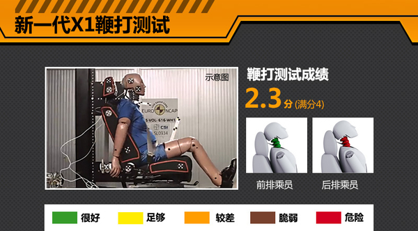 在鞭打测试中,车辆前排座椅及头枕在模拟追尾碰撞时均能为模拟假人提供良好的防护,防止乘员的颈椎过度屈伸损伤。后排座椅未能充分保护假人颈部,数据显示,后排假人有受伤风险。这项测试的满分为4分,全新X1拿到了2.3分。