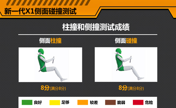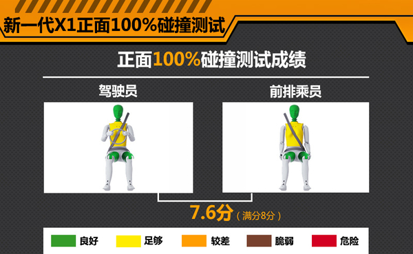 正面100%碰撞测试满分8分,新一代X1拿到7.6分。新车发动机舱在撞击时吸收了大部分能量,碰撞后车辆的A柱无明显变形,驾驶舱基本保持良好的完整状态。撞击中正面安全气囊及时弹开为模拟驾驶员假人提供良好的保护,车内后排乘客同样受到受到足够的防护。