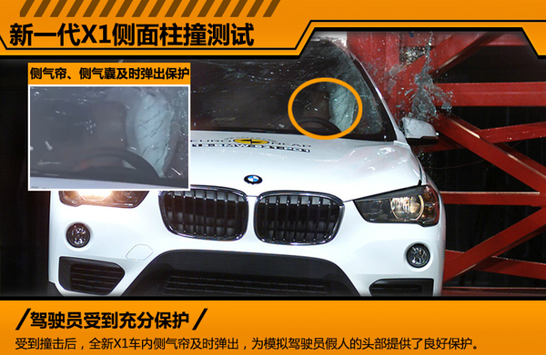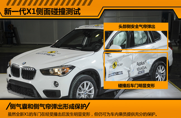 在侧面撞击中,新车同样具有良好的表现,拿到满分8分。受到撞击时,全新X1的侧气帘和侧气囊及时弹开,使模拟驾驶员假人受到良好的保护。车门在受到撞击后虽然发生明显变形,但仍能为车内乘员提供充分的防护。
