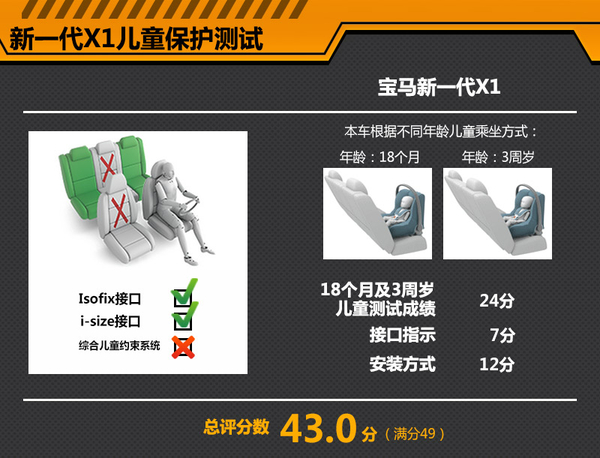 此项测试的满分是49分,新一代X1共拿到了43分。车内18个月和3周岁的模拟假人均被固定在背向式儿童安全座椅,并在正面40%碰撞和侧面碰撞中均拿到最高分。在侧面碰撞时,模拟儿童假人被束缚在座椅中减少了与车辆内部的接触。全新X1副驾驶位置的安全气囊可以关闭,以便允许在座位上使用背向式儿童安全座椅,并且能为驾驶员提供清晰的使用方式以及警示信息。在儿童座椅接口方面,新车在后排座椅上提供了2个接口,可安装Isofix或i-Size标准接口儿童座椅。