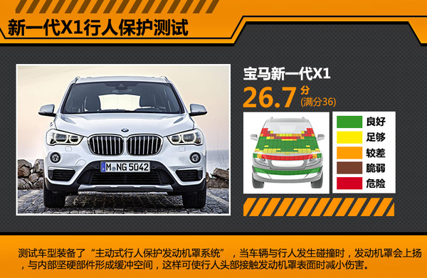 行人保护项总成绩满分36分,全新X1的成绩为26.7分。测试车型装备了“主动式行人保护发动机罩系统”,当车辆与行人发生碰撞时,发动机罩会上扬,与内部坚硬部件形成缓冲空间,这样可使行人头部接触发动机罩表面时减小伤害。宝马表示,该系统对行人的不同身材以及不同速度均适用。因此在行人头部安全单项测试中此车得分较高,为19.4分。此车的保险杠在对行人腿部测试中发挥了减少伤害的作用,拿到单项6分的成绩。发动机罩前缘区域在测试中会对行人骨盆造成一定伤害风险,因此骨盆保护项得分较低。