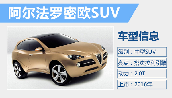 | 阿尔法罗密欧 | 暂未命名 | 中型SUV | 2016年 | |