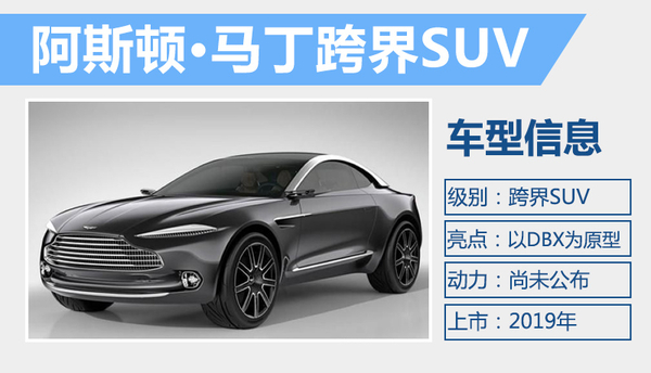 阿斯顿·马丁的跨界SUV将基于DBX概念车打造而成。DBX概念车定位于大型GT车型,采用双门四座布局,家族化的“大嘴”中网造型具有很高的品牌辨识度,修长的前大灯配合夸张的发动机线条,表达出强烈的视觉冲击力,同时也突出了整车的运动气质。动力部分,阿斯顿•马丁DBX采用纯电动驱动系统,电动机位于车轮内侧,可以实现四轮驱动。此外,新车还配有动能回收装置。据了解,该车有望于2019年上市。