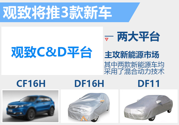 而在全新开发的D平台上,观致规划了DF11和DF16H。据了解,三厢轿车DF11将是观致汽车基于D平台推出的第一款量产车型,其车身尺寸与福特蒙迪欧相仿,动力方面则将搭载1.6T直喷涡轮增压发动机(最大功率136kW,峰值扭矩295N·m)。DF16H是基于CF16H推出的牵引力合成型四轮驱动更高端的混合动力汽车。