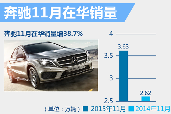 根据奔驰官方所公布的数据显示,2015年11月在华共销售36,313辆新车,同比增长38.7%;前11月累计销售量则达到335,688辆,同比增长32.8%,已大幅超过当初30万辆的年销售目标。