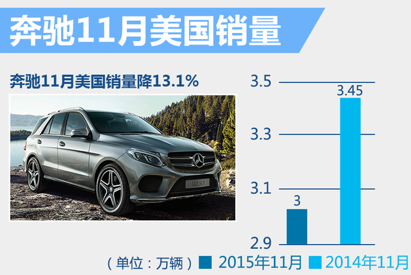 相比中国市场的快速增长,奔驰在美国市场的表现则大不相同。数据显示,2015年11月奔驰在美国销量为30,043辆,同比下降幅度达到了13.1%。这也使得奔驰前11月在美销量增幅仅为4.2%,累计为308,885辆,相比中国的销售数字有较大差距。