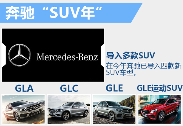 据分析,奔驰在华销售大幅增长,与其产品投放战略有着直接联系。针对SUV车型近几年在中国市场持续火爆的局面,今年奔驰实施了“SUV年”的战略,推出全新GLA、GLC、GLE以及GLE运动SUV等多款新产品,基本覆盖所有SUV级别市场,为提升在华销量发挥了重要作用。