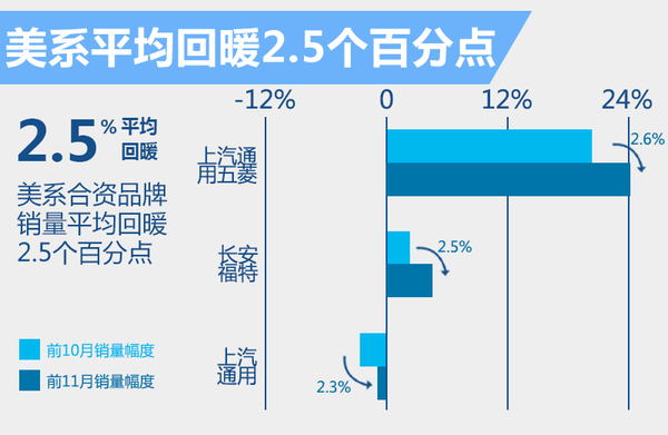 随着中国汽车市场回暖,美系车企近期的销量得到了进一步提升。其中上汽通用五菱前11月累计销量为1,018,608辆,同比增长24.4%,与前10月同比增长21.8%相比,增速加快了2.6个百分点。长安福特前11月销量同比增幅5.1%,比起前10月2.6%的同比增幅,增速加快了2.5个百分点。上汽通用前11月的销量高达1,512,376辆,虽然同比微降1.0%,但比起前10月同比降幅3.3%,已经有2.3个百分点的提升。
