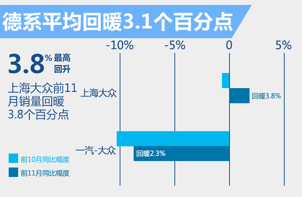 上海大众和一汽-大众作为在中国汽车市场占有最大份额的两家德系合资车企,由于受到各种因素的影响,今年的销售业绩均出现下滑。不过近期下滑趋势也有所减缓。其中,上海大众今年前10月同比销量下降1.7%,而前11月销量上升2.1%,两者相比,回升了3.8个百分点;一汽-大众前10月销量同比下滑10.8%,而前11月改善为下滑8.5%,两者相比回升了2.3个百分点。