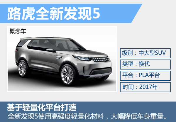 路虎全新发现5基于全新PLA平台打造,与揽胜、揽胜运动版同平台。这一平台是捷豹路虎最新的模块化轻量架构,它可以根据具体车型灵活调整,通过模块化生产打造不同轴距的车型,全面降低新车的研发成本,而较高的零件通用率能降低车辆的生产成本和养护费用。值得一提的是,基于这一平台打造的车型都使用高强度轻量化材料,降低车身重量。据悉,全新发现5将在2017年正式推出,较目前在售的发现4将有望大幅减重。