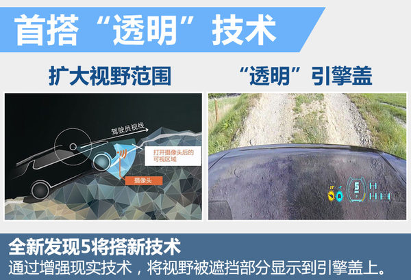 路虎曾在14年的纽约车展中亮相了一款发现概念车,这款车展示了路虎对未来车型的动感设计、尖端的科技以及无与伦比的多功能型。这其中一项名为“透明引擎盖平视显示系统”的技术极具吸引力,它通过先进的增强现实技术,将驾驶者在上下坡时被汽车引擎盖遮挡的视线画面,通过摄像头拍摄下来,然后实时投射到挡风玻璃上,造成一种“透明的引擎盖”的效果,让驾驶者感觉自己的视线并未被遮挡。