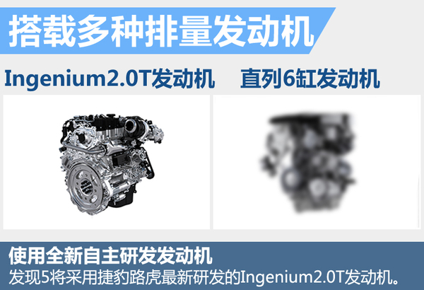 动力方面,发现5将搭载多种发动机,全系车型匹配8速自动变速箱。入门版车型有望搭载捷豹路虎全新Ingenium系列2.0升四缸发动机。这款2.0T引擎最大功率和峰值扭矩分别为177kW /340Nm。在高配车型中,则有望采用更大排量的直列6缸发动机。此外,除了传统动力车型之外,全新发现5未来还有望推出混动版车款。