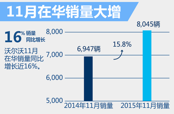 今年中国汽车市场整体呈“V”字形,各车企2015前三季度的销量增速均有所放缓,受整体市场的影响,沃尔沃也出现类似情况。但随着第四季度的到来,沃尔沃在华销量也有所提升,其中11月累计销量为8,045辆,同比2014年的6,947辆,增长近16%。