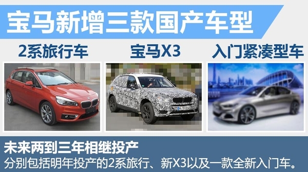 宝马目前在华投产的国产车型有3系、5系以及一款紧凑级SUV产品X1,根据宝马此前公布的系列战略规划,未来宝马在华产能将进一步扩大、国产车型数量的翻倍,由现有的三款国产车型增至6款产品,其中包括一款小于3系的全新入门级车型,一款极富功能性的2系旅行车,还有一款是专为中国市场打造的X3加长版车型,这三款车型将在未来的两到三年中相继国产。