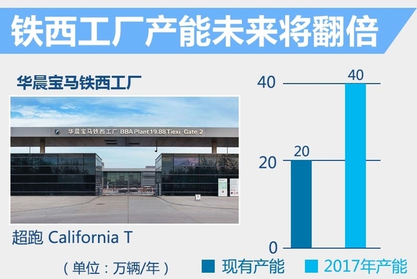 华晨宝马铁西工厂目前已实现20万辆/年的生产能力,在2013年启动的铁西工厂三期扩建项目中,在铁西征地范围内扩大生产规模,新增部分厂房和设备,在实现20万辆/年产能的基础上,到2017年9月将产能扩大到40万辆/年。为宝马新增3款国产车型的投产计划提供足够的生产能力。