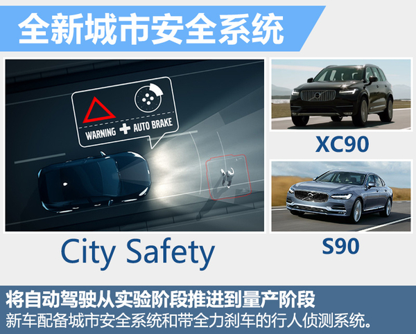 沃尔沃官方表示,应保留人类驾驶汽车的选择权。相对于无人驾驶完全接管车辆的做法,沃尔沃认为自动驾驶可以让人们畅享驾驶乐趣,并在极端条件下通过人工操作提升安全性和可靠性,从而最大程度保障驾乘者的安全。目前沃尔沃已经将自动驾驶从实验阶段推进到量产阶段。在全新SPA整车平台上生产的XC90和S90均配备了City Safety城市安全系统,包括之前的城市安全系统以及带碰撞警告及全力刹车的行人侦测系统。