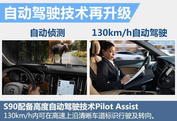 在刚刚亮相的全新S90上,沃尔沃自动驾驶技术再次飞跃性提升,无论白天还是黑夜都能够自动侦测行人、大型动物和骑行的自行车,避免碰撞发生,关键时刻自动刹车。更值得注意的是,沃尔沃S90配备高度自动驾驶技术Pilot Assist,时速130公里内可在高速公路上沿清晰可辨的车道标识行驶及转向。这一技术将沃尔沃带入了真正高度自动驾驶阶段,彻底解放了驾驶者的四肢。