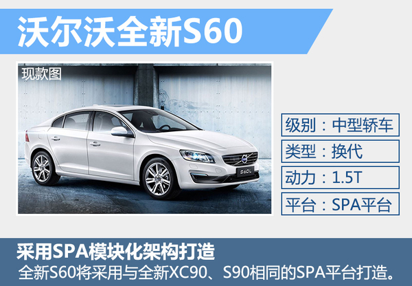 现款沃尔沃S60自2010年正式推出,经过了多次改款,在豪华中型轿车市场中具有一定的竞争力。一般欧系车的换代周期为7年左右,问世已过5年的现款S60将有望迎来换代。沃尔沃此前公布的最新产品规划,未来旗下60系列与90系列的所有车型都将采用其最新研发的SPA模块化架构。未来,全新一代的S60就将基于SPA平台打造,新车预计将在外观,配置,动力等多个方面,进行全面的升级换代。