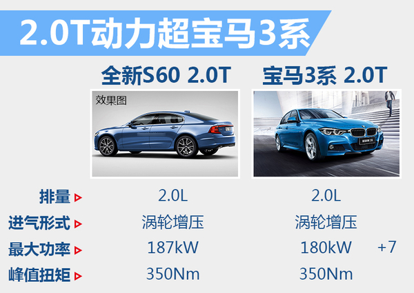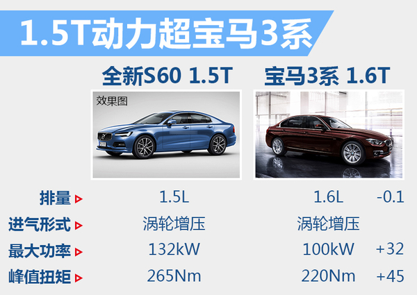 在欧系豪华品牌当中,宝马、奔驰和奥迪这三大德系品牌,均推出了三缸及四缸小排量发动机,并早已在各自的中、小型车上进行了采用。其中宝马3系搭载了最大功率为100kw,峰值扭矩为220Nm的1.6T发动机。全新S60将搭载的Drive-E三缸1.5T发动机,最大功率为132kW、峰值扭矩则达到了265Nm。与宝马3系1.6T车型相比,沃尔沃全新S60 1.5T车型在动力方面优势十分明显。