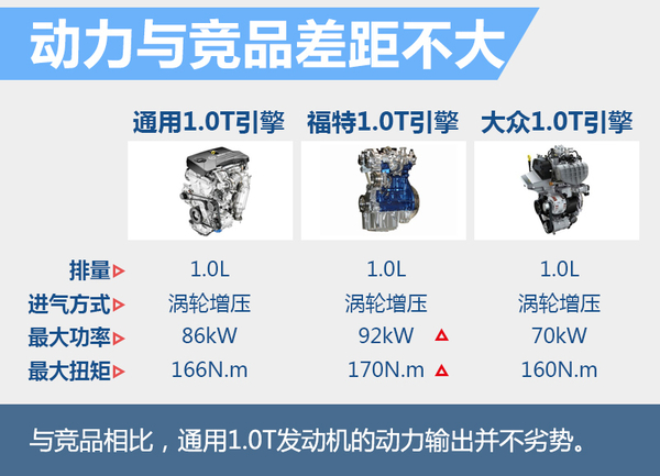 在小排量增压化日益普及的汽车市场,众多车企纷纷投入资源研发小排量涡轮增压技术,其中福特已经在华推出搭载1.0T涡轮增压发动机的车型,而大众也即将普及1.0T发动机。福特1.0T Ecoboost涡轮增压三缸发动机,最大功率92kW,峰值扭矩170N.m。与福特1.0T发动机相比,通用1.0T发动机最大功率要少6kW,峰值扭矩少4N.m,总体来看差距不大。目前大众也在逐步普及1.0T发动机,这台发动机的动力输出相比通用和福特而言不占优势。