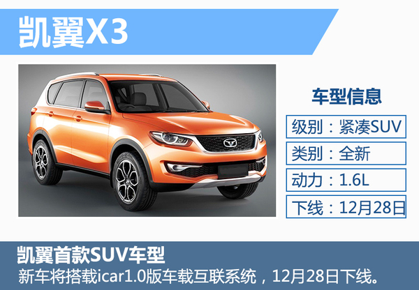 凯翼汽车此前规划了3款SUV新车,级别覆盖紧凑型到中大型,包括凯翼X3、X5以及X7,率先投放市场的车型为凯翼X3。与传统汽车制造企业的发展思路不同,凯翼汽车将互联网与汽车结合得更为紧密。此前凯翼汽车发布了智能互联战略规划,icar1.0版本将搭载到凯翼X3上采用XC51车机,未来凯翼汽车将全面普及科技配置,增强其产品阵容实力。