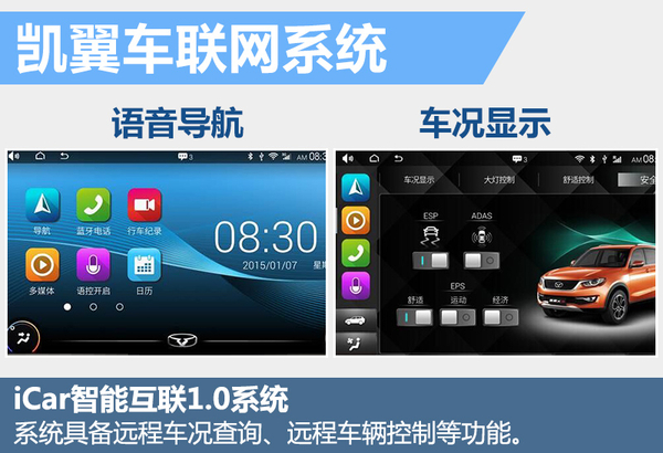 凯翼X3自带3G/4G WiFi提供联网服务,同时也可以实现车载WIFI与手机的互联。其配备的iCar智能互联1.0系统具备远程车况查询,远程车辆控制,远程防盗安防服务,智能出行管家,车载娱乐,车辆状态监测,通讯录同步等功能。此外该车还将配备较高级别的电子全系统,如车道偏离预警,盲区自动监测,全景泊车等。