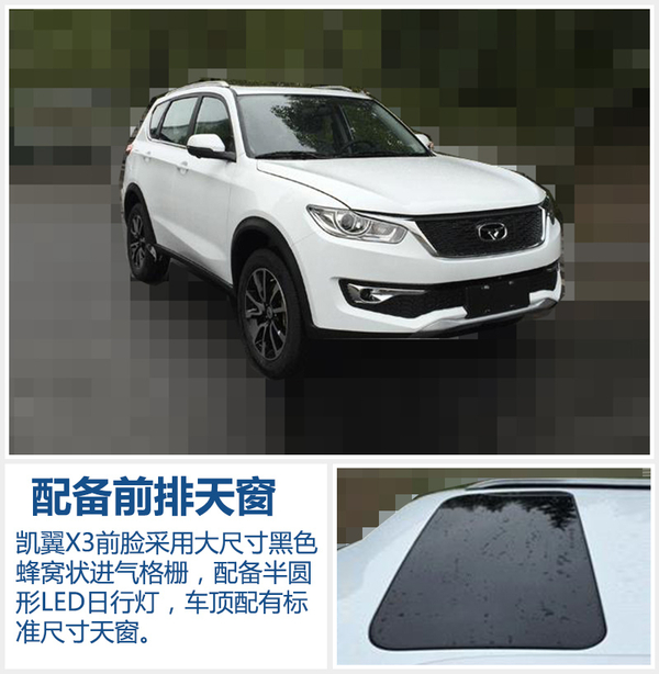 凯翼X3前脸采用大尺寸黑色蜂窝状进气格栅,搭配双侧头灯组呈现“展翼”造型,下格栅采用相同材质与上格栅呼应,头灯组还集成了环形LED日间行车灯,点亮后辨识度及视觉效果均十分出色。该车配备黑色双五辐轮毂,增添了运动感。此外凯翼X3配备了覆盖前排乘客的天窗,可提升车内驾乘空间的舒适性。