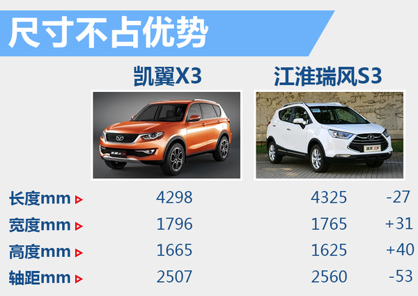 凯翼X3尾部整体造型十分动感,配备外挂式备胎,下包围采用黑色材质设计并搭配雾银材质下护板,在视觉效果及实用性方面均有所提升。该车长宽高尺寸达到4298*1796*1665毫米,轴距为2507毫米,与江淮瑞风S3、中华V3等小型SUV尺寸更为接近,上市后也将对后者构成威胁。