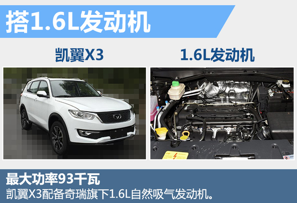 动力方面,凯翼X3将搭载1.6L自然吸气发动机,最大功率达到93千瓦,最大扭矩160牛米,匹配变速箱后百公里油耗为7.4L。该发动机来自奇瑞汽车,与瑞虎3搭载的1.6L发动机一致,应用了DVVT连续可变进排气正时技术,在保证燃油经济性的基础上,可进一步提升动力效果。