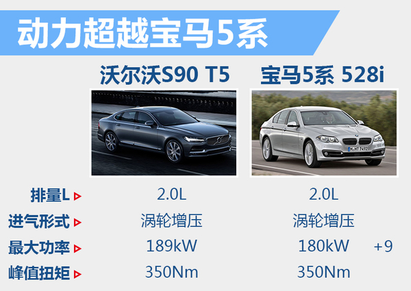 在豪华中大型轿车领域中,宝马5系同样采用了多台动力输出不同的2.0T发动机,其中宝马5系528i车型采用的是高功率版2.0T发动机。这台发动机的最大功率为180kw,峰值扭矩达到350Nm。沃尔沃S90 T5搭载的2.0T发动机与宝马5系528i 2.0T发动机相比,峰值扭矩相同,最大功率则高出对手9kW。可见沃尔沃S90“入门版”的动力性能更出色。