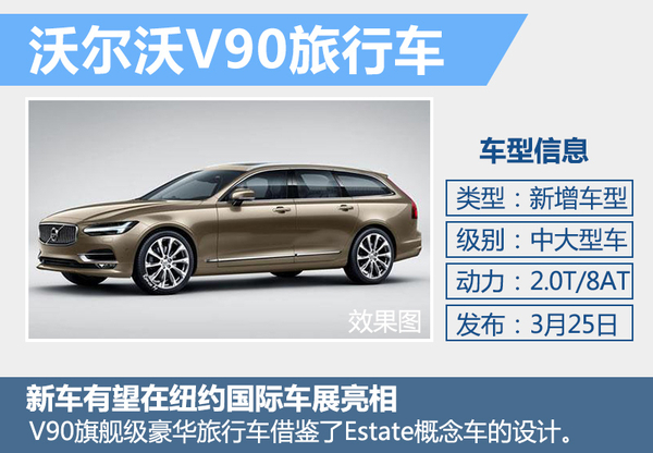 根据官方公布的消息,2016年纽约国际车展会在3月25日开幕。沃尔沃全新旗舰级旅行车V90将有望在纽约国际车展期间进行全球首次亮相。从网通社获得的效果图来看,沃尔沃V90旗舰级豪华旅行车借鉴了Estate概念车的设计,车身修长、匀称。在前脸部分,V90最大的特点依旧是在全新一代XC90与S90上都能看到的“雷神之锤”头灯以及稍向内凹的直瀑式进气格栅。