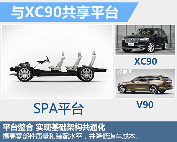 沃尔沃的生产体系将整合成两个全新的模块化架构,分别是SPA和CMA平台。这其中CMA平台主要用于小型车的研发和生产,将以40系列及以下产品为主;SPA平台则会用于生产全新一代60系列的中型车和90系列的旗舰产品。V90旗舰级旅行车与XC90一样,都出自SPA(Scalable Platform Architecture)可扩展架构。SPA平台的成功开发,使沃尔沃将原本多平台复杂化的产品序列整合为共通的基础框架,能够在更大范围实现技术共享。这样的可扩展模块化设计可以提高零部件的质量以及车辆装配水平,并能起到缩短研发周期和降低造车成本的作用。