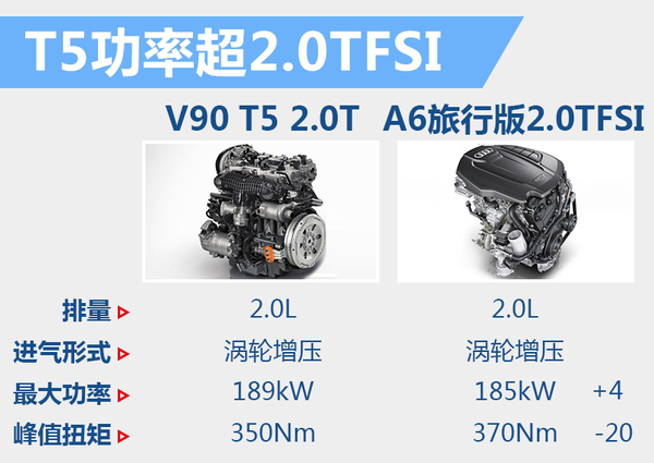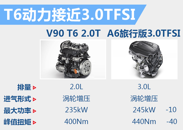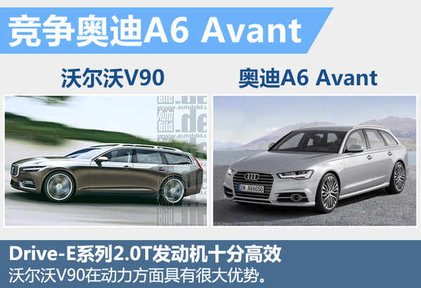 目前,在豪华中大型旅行车这一细分领域,奥迪A6 Avant刚刚经历中期改款,无论是外观、内饰还是动力系统都进行了更新和升级。沃尔沃V90在推出之后,将与奥迪A6 Avant进行竞争。V90 T5搭载的Drive-E 2.0T发动机最大功率189kW,峰值扭矩350Nm。T6版本的两项数据则分别达到了235kW和400Nm。沃尔沃V90 T5的发动机输出数据与奥迪A6 Avant的2.0T车型不相上下。V90 T6则凭借更小排量的双增压2.0T高效发动机,达到了接近A6 Avant 3.0TFSI“大排量”发动机的动力输出。