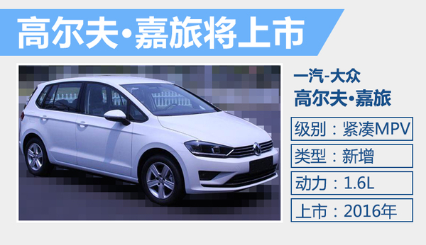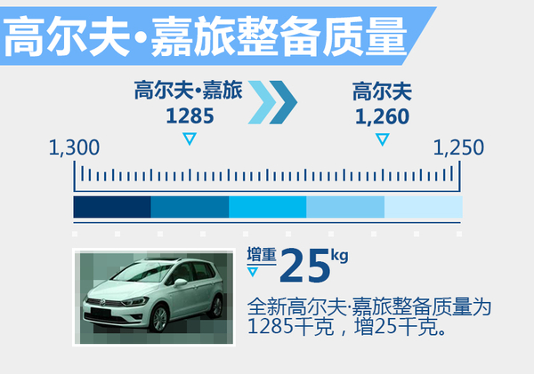 高尔夫·嘉旅定位于入门级MPV,将在一汽-大众佛山工厂进行量产,新车与高尔夫7同样将基于MQB模块化平台打造,采用了大量的轻量化处理。此次公布了高尔夫·嘉旅1.6L车型的整备质量为1285千克,相比普通版而言增加了25千克。