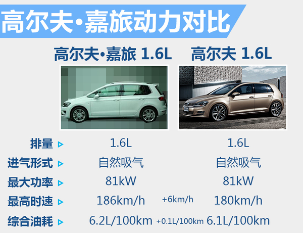 动力方面,国家工信部公布了搭载1.6L发动机的高尔夫·嘉旅车型的相关数据。动力采用与普通版车型所采用的1.6L相同,最大功率81kW。不过高尔夫·嘉旅1.6L车型的最高时速达到了186km/h,比普通版高6km/h,百公里油耗上则基本相同,仅相差0.1L/100km。