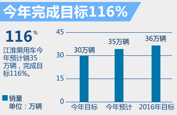 今年1-11月,江淮乘用车累计销量31.17万辆,提前一个月达成年度目标。截止12月29日,江淮乘用车已累计销售347,795辆,预计全年将完成35万辆销量,达成30万销量目标的116%。在汽车市场整体销量增速放缓的2015年,江淮这一市场表现可称得上是不俗。2016年,江淮汽车将整体销量目标定为60万辆,包括乘用车、商用车及新能源产品,其中乘用车销量目标为36万辆。