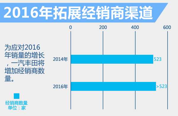 一汽丰田2014年底经销商数量为523家,2015年官方并没有公布最新数据,但一汽丰田汽车销售有限公司企划部副部长吉村郁夫在与网通社沟通时表示:“为应对2016年销量的增长,一汽丰田将增加一些4S店。”目前各大车企都在将4S店向三、四线城市扩展,一汽丰田也有望效仿这一措施,让更多的消费者可以接触一汽丰田的产品。