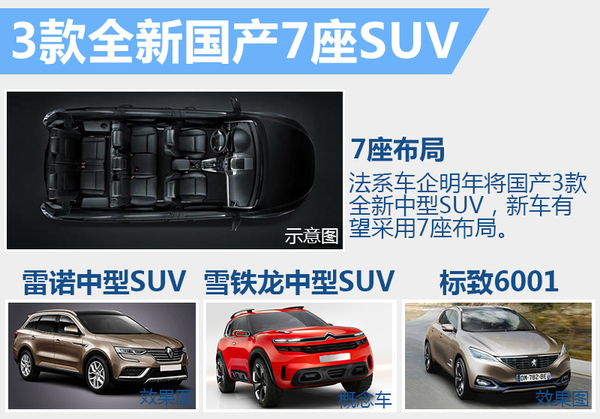 随着消费者生活水平的提高和二胎政策的出台,7座SUV车型的需求日益增加。目前在中型SUV领域,丰田汉兰达和福特锐界已经推出了7座版本的车型,这两款车11月的单月销量都达到一万辆左右。明年,共有3款全新法系中型SUV将国产并有望采用7座布局,分别是雷诺全新中型SUV、雪铁龙的中型SUV以及有望命名为6001的东风标致中型SUV。