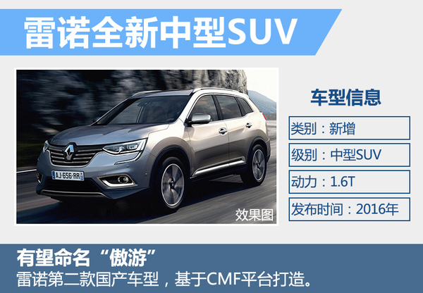 | 雷诺全新SUV | 中型SUV | 新增 | 2016年下半年 |