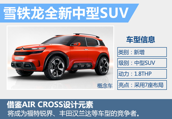 根据东风雪铁龙将发展新规划,明年将推出两款“高端车”,包括一款全新中型SUV。这款车将是东风雪铁龙推出的尺寸最大、级别最高的SUV车型。新车将搭载PSA(标致雪铁龙集团)最新研发的1.8THP发动机,最大功率可达150kW。在外观方面,新车将借鉴雪铁龙概念车AIR CROSS的设计元素,采用分层式的进气格栅与双LED大灯组,造型前卫新潮,偏向年轻化。7座的布局形式也使得这款车具有很强的实用性。
