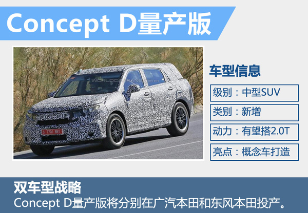 在丰田全新汉兰达、福特全新锐界等7座SUV相继推出之后,本田也在对该细分市场产品进行规划。在去年上海车展期间,本田全新Concept D概念车正式发布,该车专为中国市场打造,其量产车型将是一款7座SUV,并分别在广汽本田和东风本田投产。本田此前发布了专为中国市场打造的包括2.0T在内共三款涡轮增压发动机,从车型定位来看全新中型SUV未来有望搭载2.0T发动机。