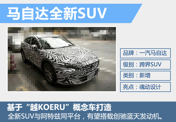 2016年一汽马自达计划推出的全新SUV将基于“越KOERU”概念车打造,从目前曝光的谍照来看,量产车型在外观方面与概念车十分相似,新车有望搭载2.0L以及2.5L自然吸气直喷发动机。据悉,马自达全新SUV定位低于CX-5,高于马自达3,上市后有望成为一汽马自达旗下新的主力车型。一汽马自达全新SUV将与阿特兹基于相同平台打造,现款阿特兹搭载2.0L和2.5L创驰蓝天发动机,从车型定位以及与阿特兹同平台打造等因素来看,一汽马自达全新SUV未来也有望搭载这两款创驰蓝天发动机。