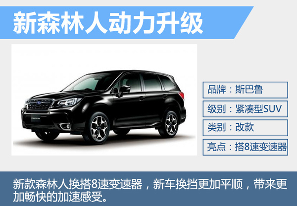 斯巴鲁新款森林人已于去年东京车展中首发亮相,新车在外观和内饰细节上进行了升级;除此之外,新款森林人2.0T涡轮增压发动机车型在传动系统方面将搭载8速变速器,现款车型传动系统为CVT无级变速器和6速手动变速器。相比之下,新款森林人的变速器增加了挡位,使得车辆在行驶过程中换挡更加平顺,为车内乘客带来畅快的加速感受,市场竞争力也将得到大幅提升。