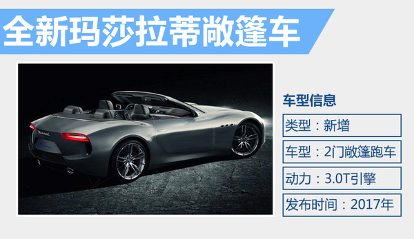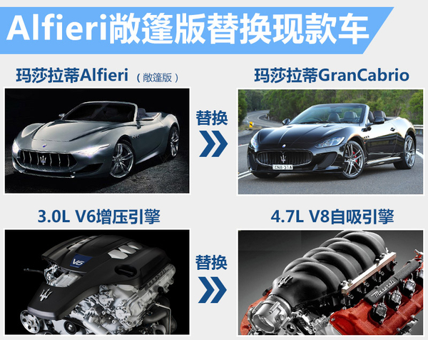 根据玛莎拉蒂2014至2018年的5年发展规划,敞篷版Alfieri将会在2017年推出,届时现有的GranCabrio敞篷跑车将会停产,Alfieri敞篷版将取代GranCabrio成为玛莎拉蒂旗下新一代敞篷跑车。而现款GranCabrio车型所搭载的4.7L V8自然吸气引擎,也将被更小排量的3.0L V6双增压引擎取代,从而获得更低的排放和更出色的燃油经济性。