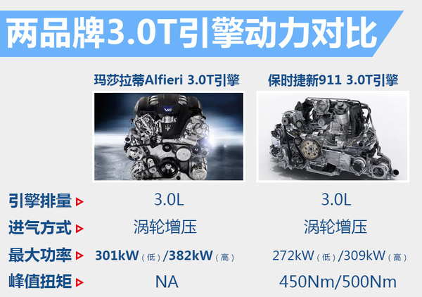 在豪华性能跑车阵营中,保时捷已有全新3.0L增压引擎供旗下新911敞篷跑车搭载。玛莎拉蒂新一代敞篷跑车将搭载的小排量引擎与保时捷同排量引擎相比,高低功率版引擎最大功率数据优于对方。其中玛莎拉蒂全新3.0T引擎低功率版的最大功率高出保时捷3.0T引擎29kW,而高功率版引擎最大功率则高出对方73kW。