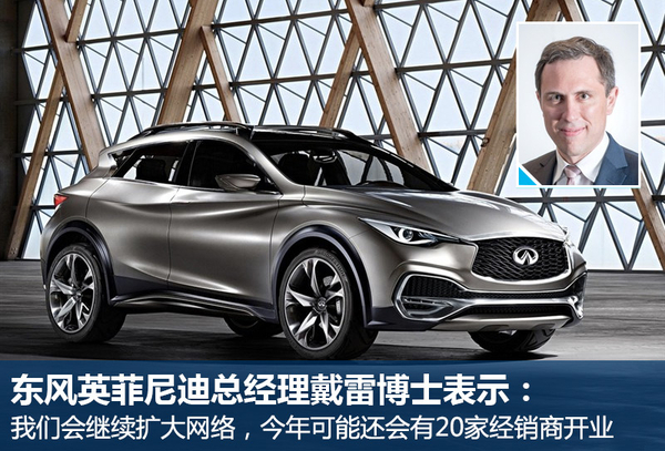 东风英菲尼迪目前已经成立了一年之久,在Q50L和QX50两款国产车型的出色表现下,英菲尼迪2015年累计在华销量40,188辆,同比增长33.8%。英菲尼迪在产品竞争力全面提升的同时,在渠道方面还将继续发力。关于英菲尼迪经销商网络方面的规划,东风英菲尼迪总经理戴雷博士在与网通社编辑沟通时表示:“我们会继续扩大网络,今年可能还会有20家经销商开业”。