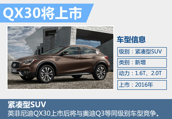 英菲尼迪首款紧凑型SUV——QX30已于广州车展中全球首发,新车与奔驰GLA同平台打造,采用英菲尼迪“冲突美学”设计理念,造型时尚、前卫。QX30在动力方面搭载1.6T和2.0T涡轮增压发动机,能够满足一款紧凑型SUV对于动力输出的需求。“作为英菲尼迪首款紧凑型豪华SUV,QX30的推出标志着英菲尼迪正式进军紧凑型豪华车细分市场,这一细分市场是全球增长最快的细分市场。”东风英菲尼迪总经理戴雷说道。