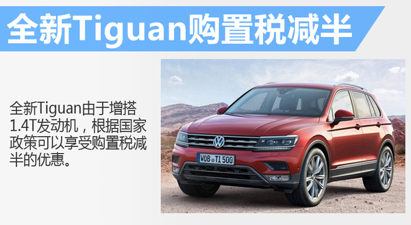 由于全新Tiguan入门级车型搭载了1.4T发动机,在排量上符合国家出台的关于1.6升及以下排量乘用车实施减半征收车辆购置税的优惠政策,所以大众全新Tiguan的1.4T车型可以享受这个政策,税率由10%下降到5%,使得消费者购车时的最终费用也得到了进一步下降。