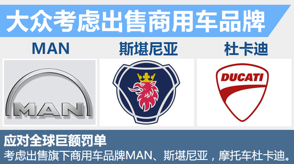 大众集团在去年因“柴油车排放造假”在全球众多国家受到巨额处罚,据不完全统计,大众将支付近150亿欧元的罚单,并对1,100万辆柴油车进行召回和整改维修,将导致大众集团陷入巨大的资金压力。近日,网通社援引美国底特律新闻消息:大众集团计划出售商用车业务中的MAN、斯堪尼亚品牌,高性能摩托车品牌杜卡迪也在考虑范畴,从而应对大众集团可能遇到的资金链问题。